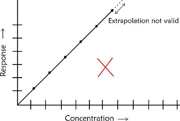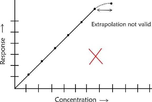 - The calibration line should not be extrapolated beyond the highest concentration recorded as you would not be sure about linearity beyond this point