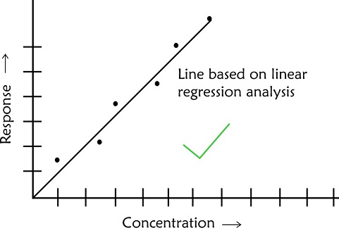 - In case of scatter of calibration points use linear regression analysis to establish a best fit line. Do not make personal judgement to decide on the best line which passes through the origin