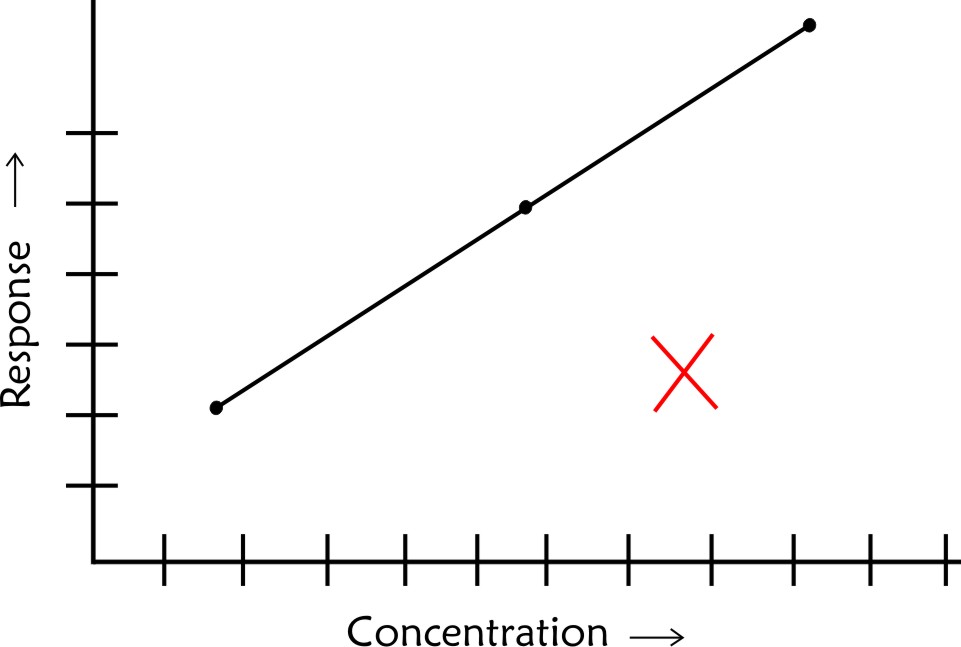 The concentration of unknown is determined by drawing a perpendicular to the concentration axis from the point of corresponding response. In addition to information on concentration of unknown a calibration plot provides additional information on